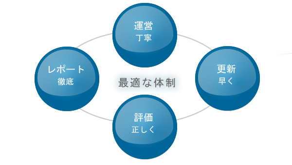 徹底した報告レポート、業務分析と評価、スピーディーな更新をくりかえし、常に最適な体制を維持します。